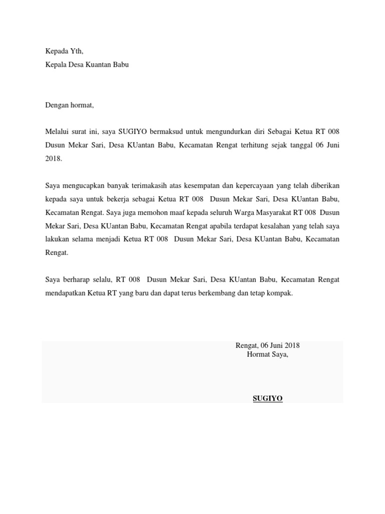 Surat Pengunduran Diri Dari Ketua Rt - Contoh Surat Pengunduran Diri Resign Baik Benar Sopan / Berikut contoh ringkas beberapa surat pengunduran diri resmi.. Download contoh surat pengunduran diri dari perusahaan. Contoh surat pengunduran diri rumah sakit yang baik dan via detiklife.com. Keluargaku terdiri dari ayah ibuku dan seorang adik perempuan yang bernama fina. Dan mohon maaf bila selama ini dalam kepemimpinan saya. Demikian surat pernyataan ini semoga bisa dipahami maksud yang disampaikan.